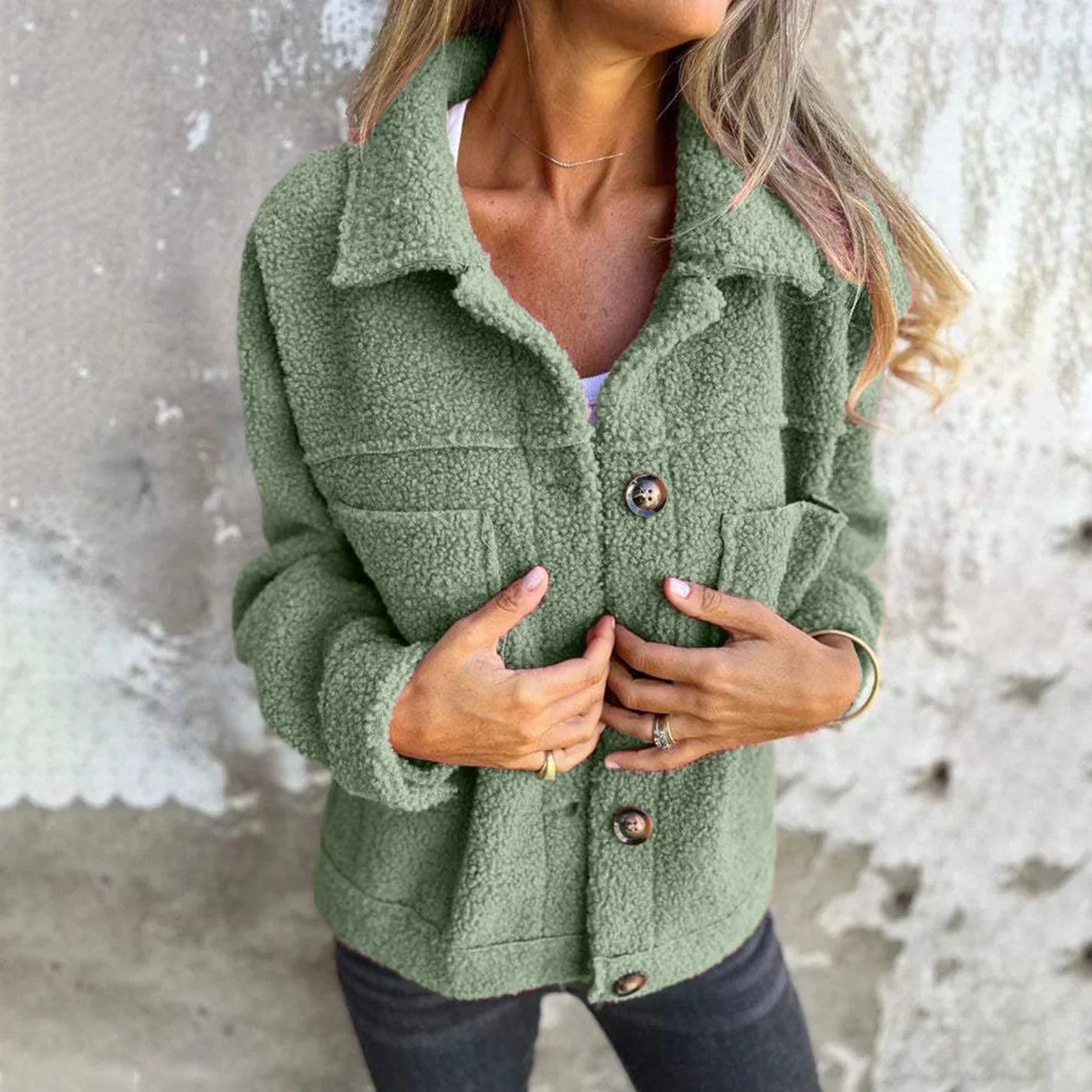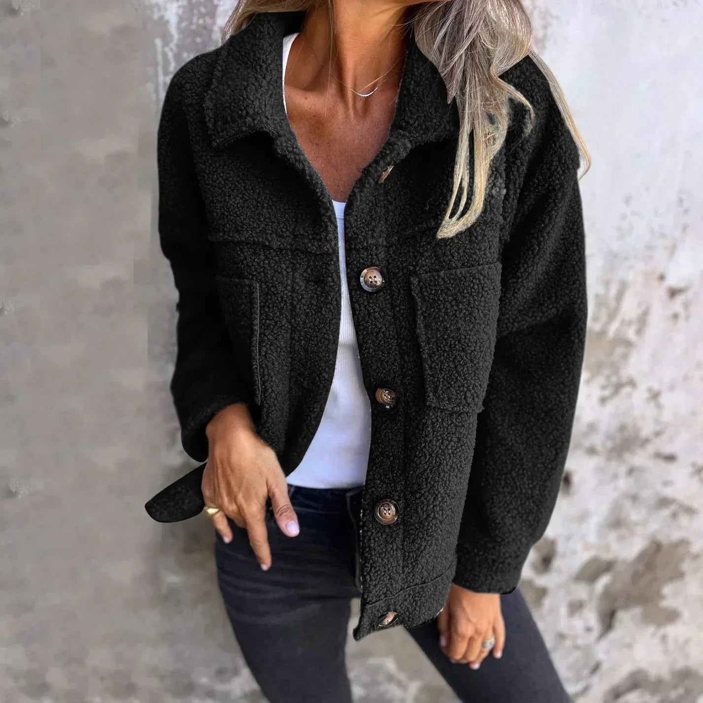 Cette veste en sherpa boutonnรฉeย est unย parfait mรฉlange de chaleur, deย confortย et deย style.ย Fabriquรฉe en tissu sherpa doux et moelleux, elle offre uneย couche chaleureuseย pour les jours frais tout en restantย tendance. Avec saย coupe ampleย et saย fermeture boutonnรฉe, cette veste ajoute uneย touche chicย etย polyvalenteย ร nโimporte quelle tenue. Elle est disponible dans uneย variรฉtรฉ de couleurs attrayantes, y compris leย noir classique, leย rose pastel, leย vert saugeย et leย jaune moutarde, vous permettant de choisir celle qui convient le mieux ร ย votre style.