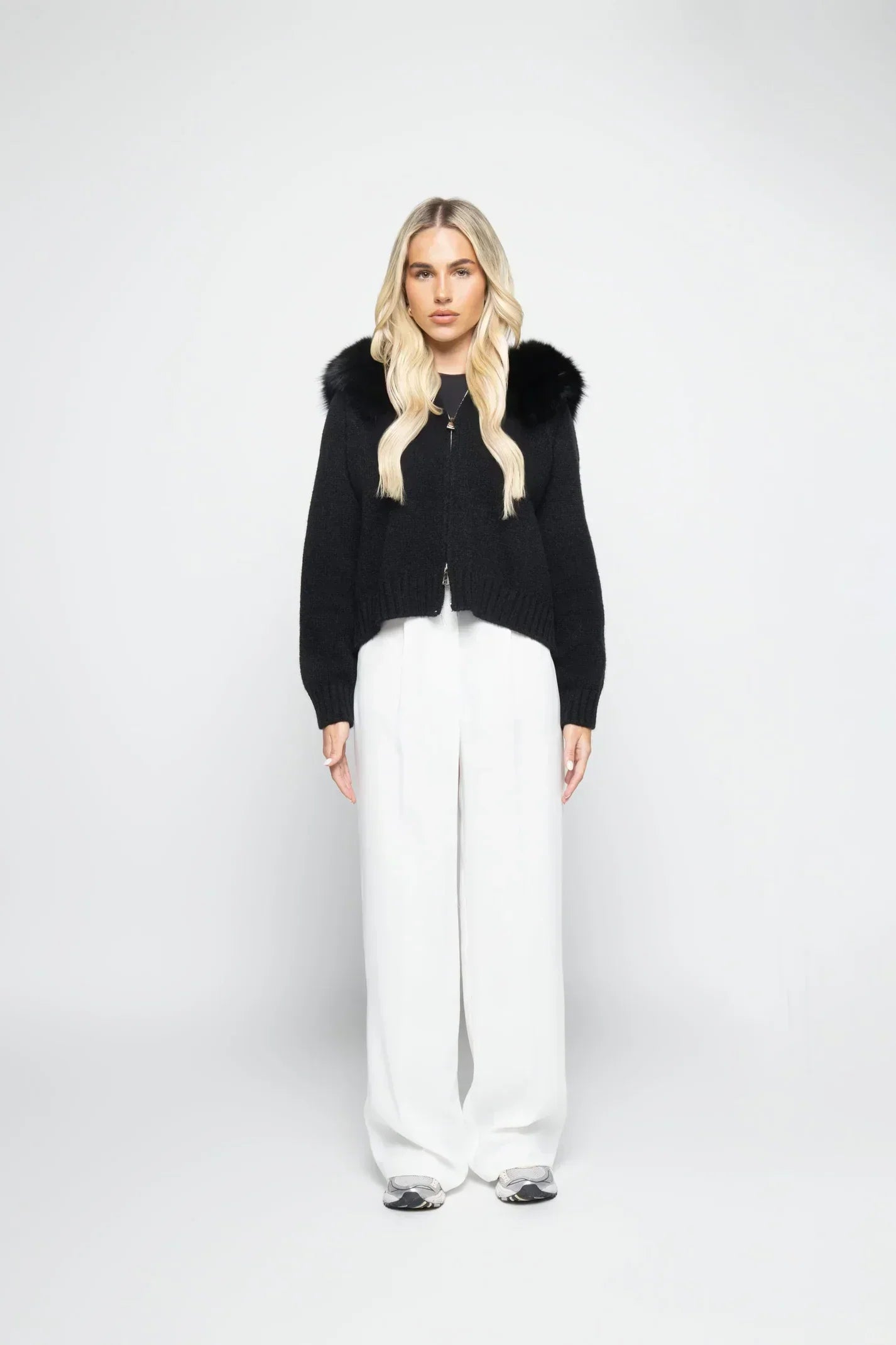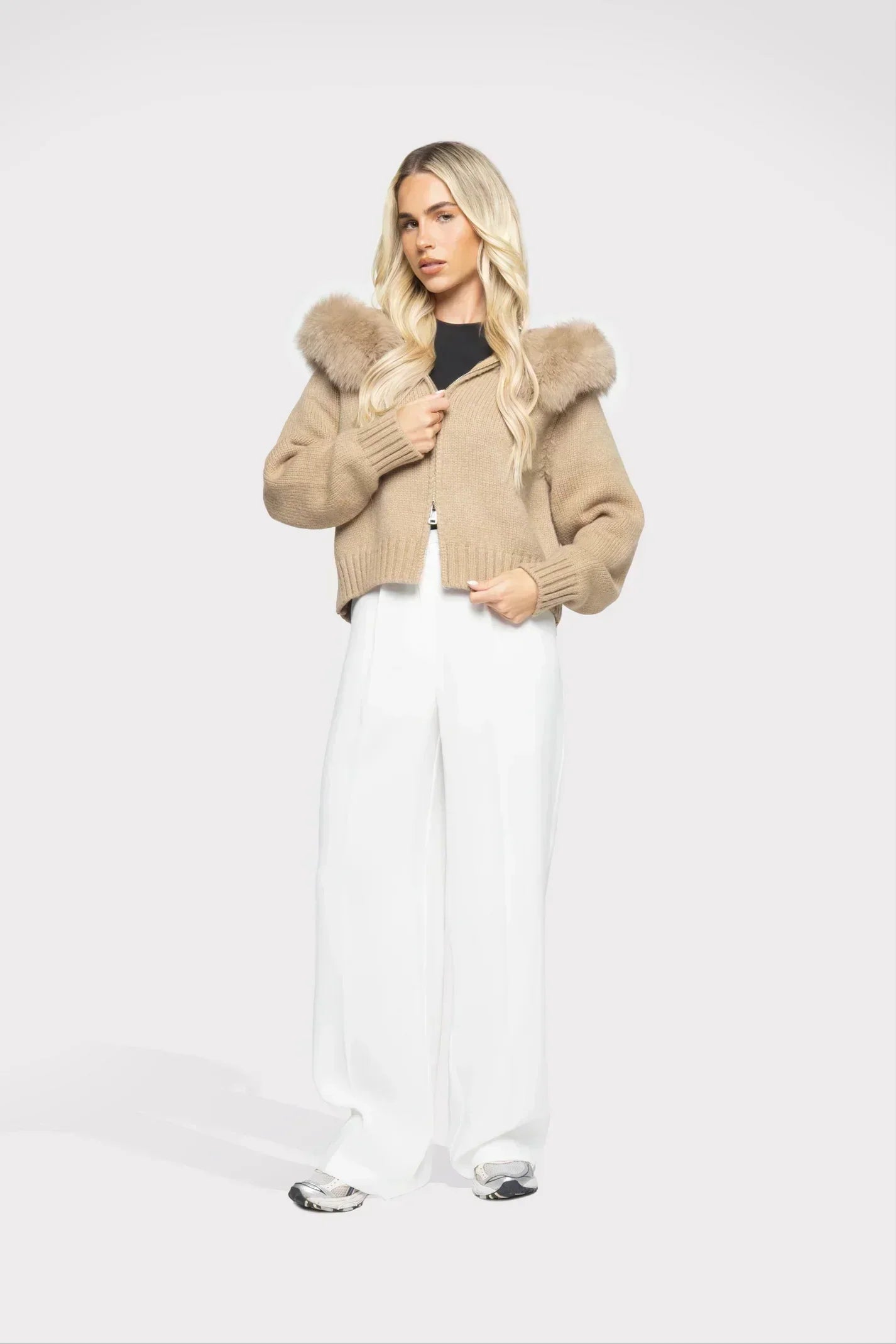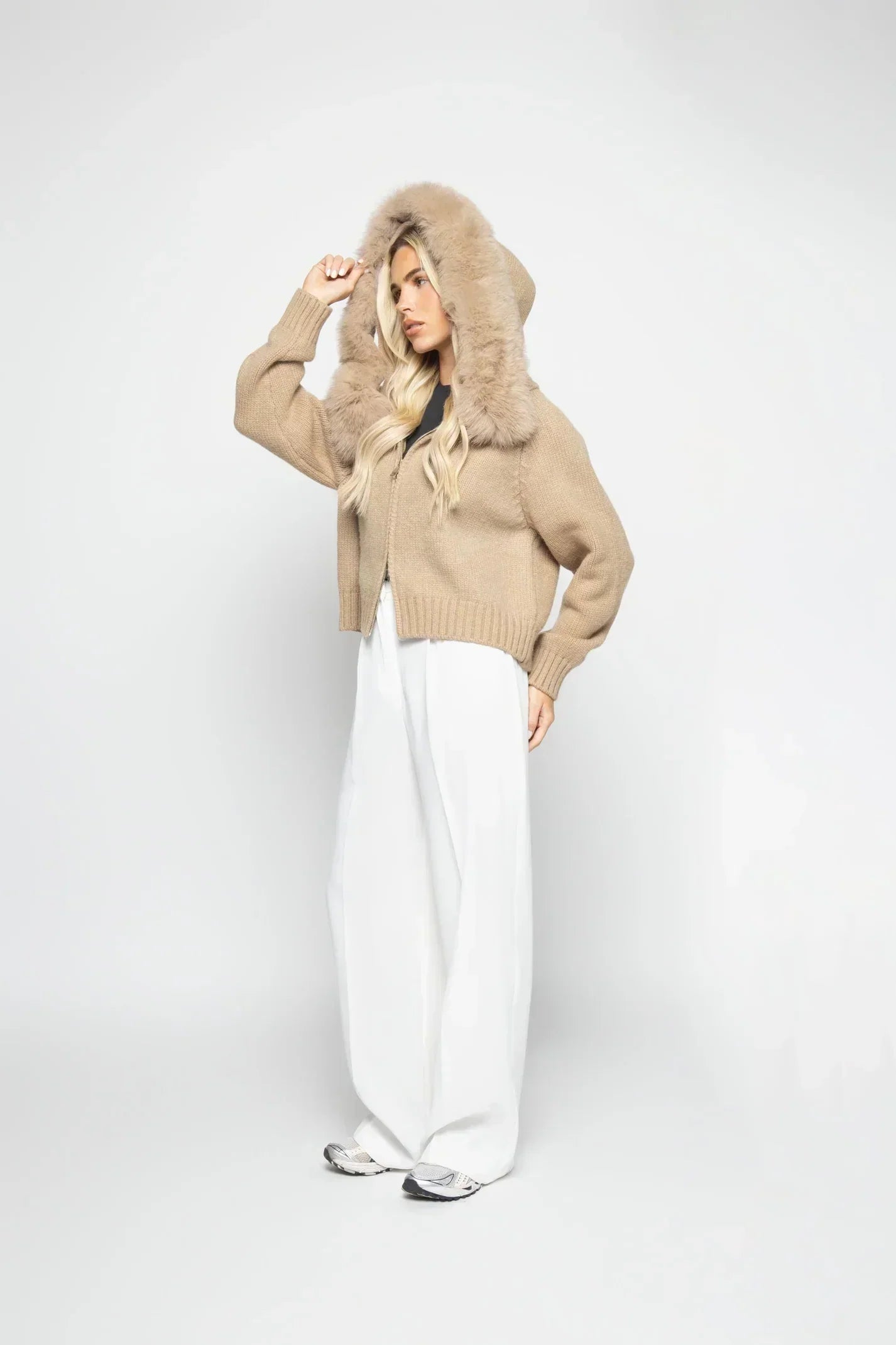 Affrontez lโhiver avec style grรขce ร cette veste en laine ร capuche, dรฉcorรฉe de fourrure douce et raffinรฉe.